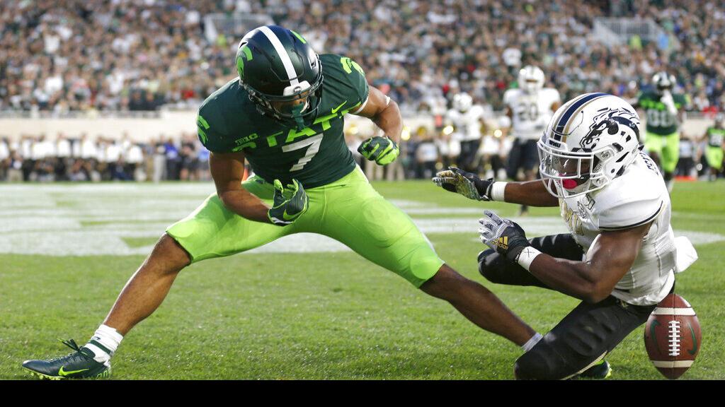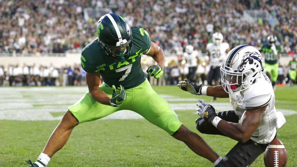 Western Michigan's D'Wayne Eskridge, right, breaks up a pass in the end zone intended for Michigan State's Cody White (7) during the first quarter of an NCAA college football game, Saturday, Sept. 7, 2019, in East Lansing, Mich.